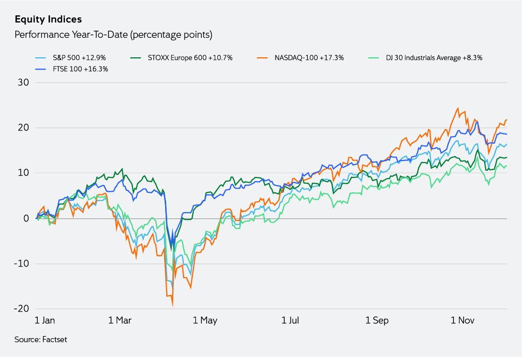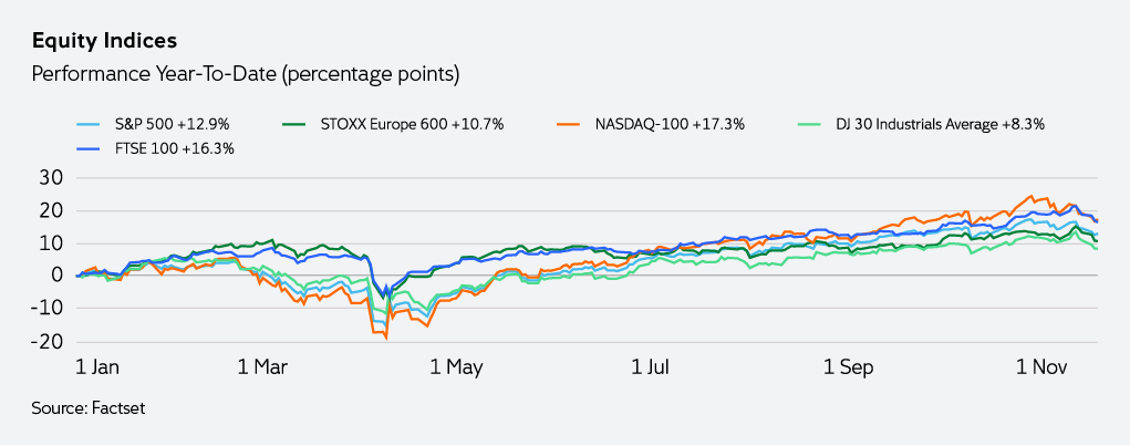 Global equity markets have recovered steadily since the April “Liberation Day” sell-off. Expectations of Fed policy easing and continued momentum in the AI revolution have pushed indices to fresh highs. Yet the headline rally masks a more nuanced backdrop. Markets are late in the cycle and the bull market euphoria remains tightly linked to the Fed’s next moves. Without further rate cuts, the current momentum could prove fragile.